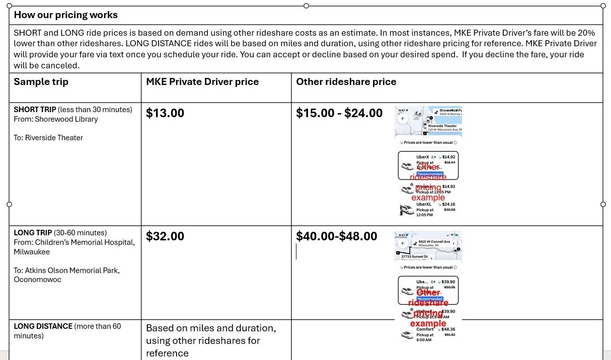 MKE Private Driver is owned and operated by Christine H., a licensed and insured mature driver.
